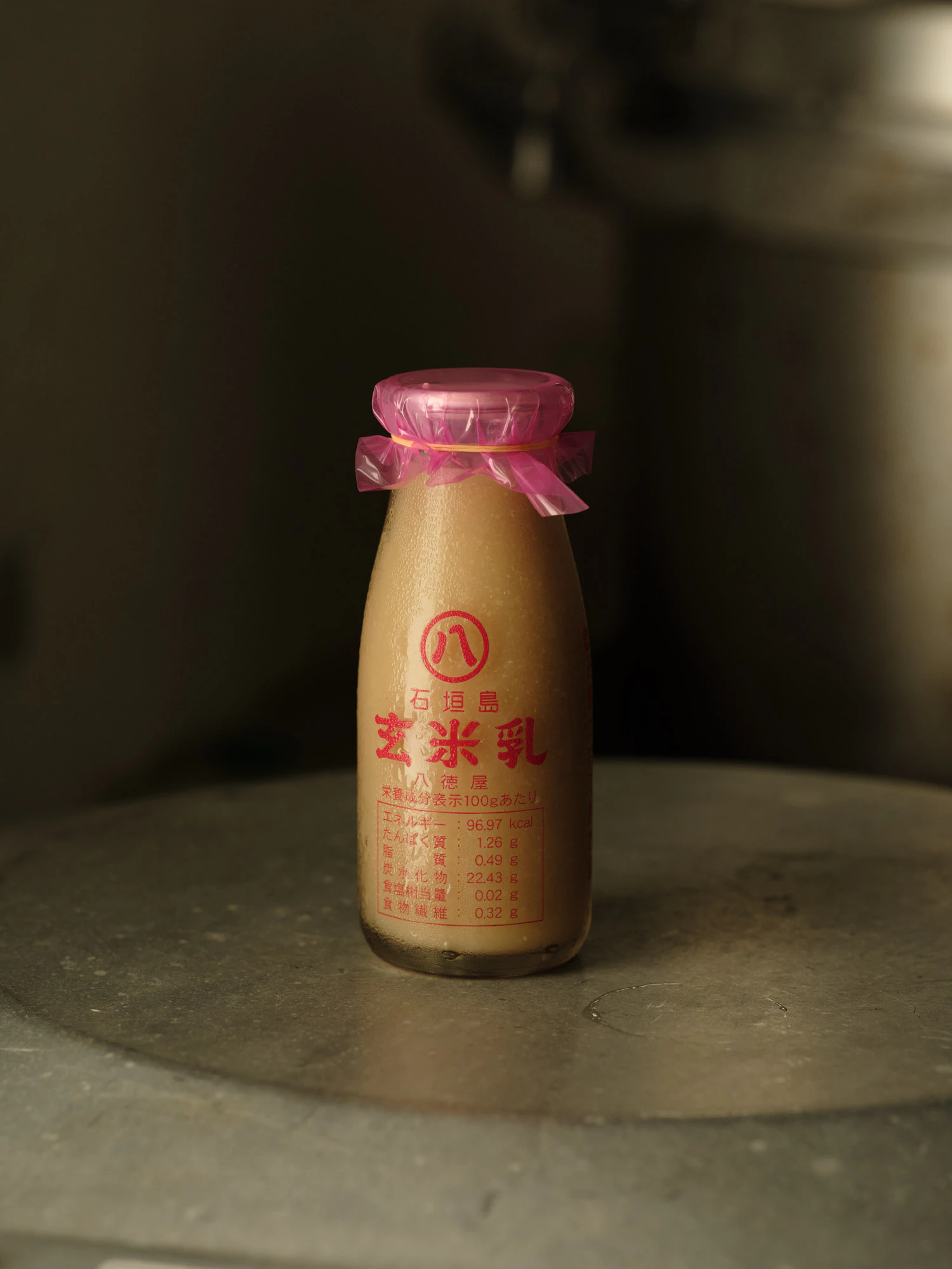玄米乳はとろみがありながらも爽やかな飲み口の玄米由来のドリンクで、島民に親しまれてきた。 2012年、玄米乳の考案者が新聞広告で後継者を募り、石垣島出身の徳比嘉充さんが手を挙げ事業を引き継いだ。徳比嘉さんは沖縄産米と砂糖のみにこだわり、瓶詰め前に自ら全ロットの甘みをチェックしている。ちなみに、 2種類のパッケージがあり、一つは昔ながらの牛乳瓶と同じオリジナルで、もう一つは徳比嘉さんが考案したアルミキャップで包装したバージョンだ。違いは賞味期限の長さ。シチュエーションによって選ぶと良い。