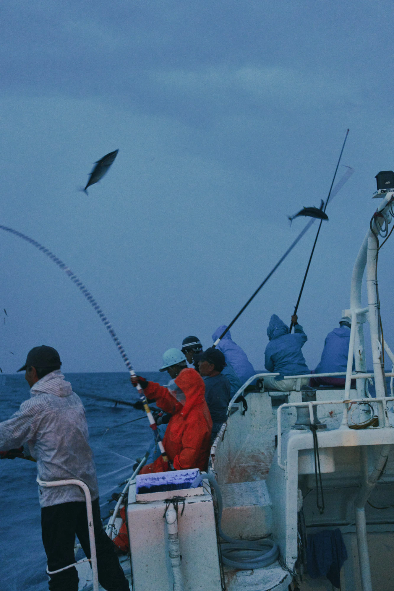 When fishing for bonito, one person scatters live bait into the sea, and seven others reel in the bonito using single-hook fishing. Using the skilled technique of removing the hook mid-air, the bonito appear to jump into the boat of their own accord. They fishermen catch a bonito almost every second. Then immediately kill the fish and then throw them into icy water. This is the secret to the astonishing freshness of the catch. Throughout the five-hour fishing trip, Captain Hajime speaks very little, and he commands the crew through gestures. He is also constantly moving the boat towards schools of fish. On the day of our photos, it was the second biggest catch of the season.