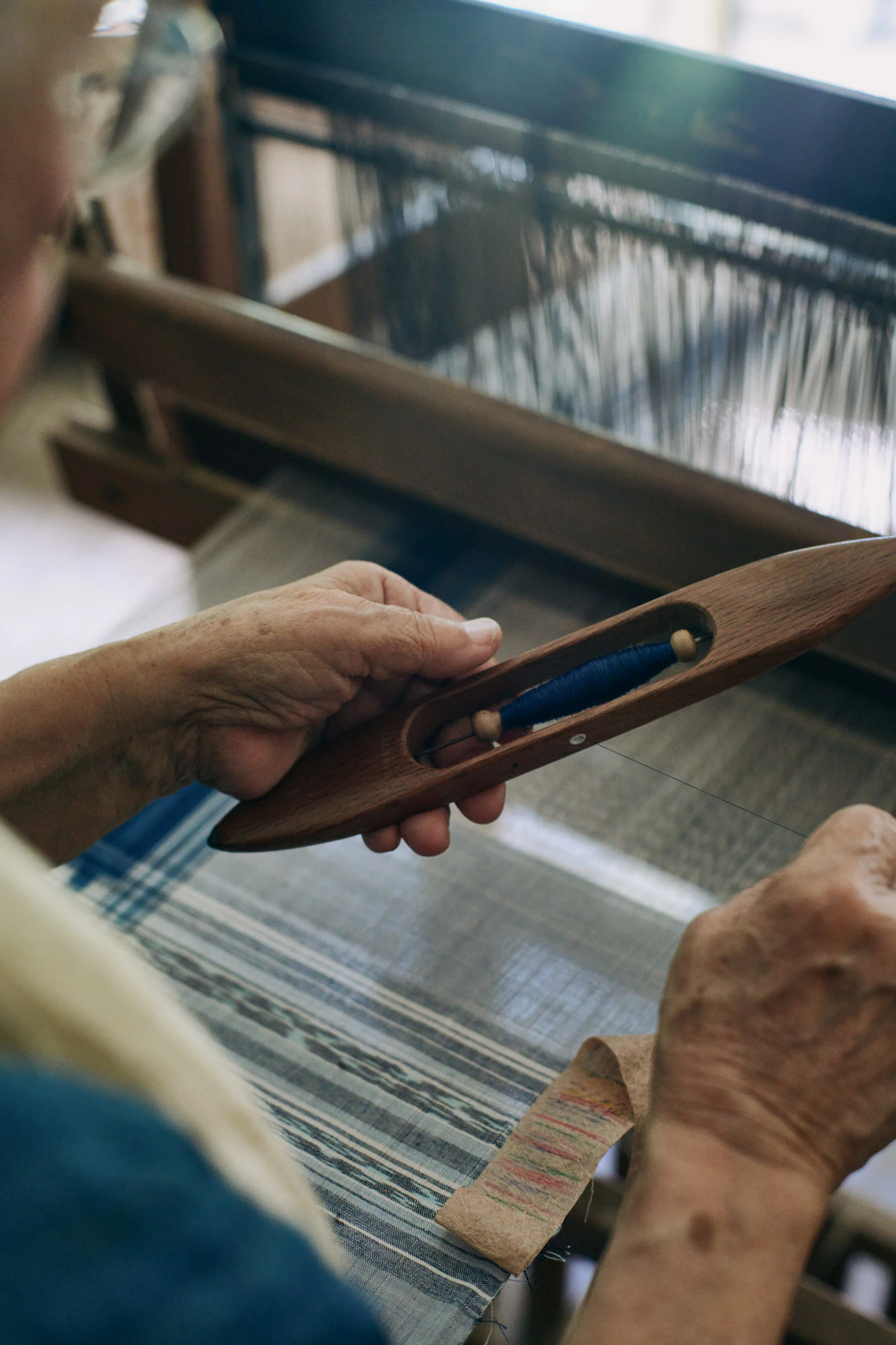 Born from this environment are textiles with rich colors, ranging from the deep red hues of hirugi mangroves to the golden yellow of fukugi and the deep shades of indigo, exuding an air of the island itself. The creation of colors culminates with the traditional process of umi-zarashi sea bleaching. “The sea is closely related to Okinawan life, and so umi-zarashi used to be done all over Okinawa. But as the waters became polluted it became less widespread,” explains Ishigaki. The process unfolds at a snaking corridor of hirugi mangroves on the mudflats near the workshop. Planted and tended to by Ishigaki over the years, the “Umi-zarashi Road” is where her textiles are taken to be washed and soaked. The brackish mix of fresh- and saltwater binds the pigments and minerals, such as magnesium, producing a color-fixing effect and preventing mold from forming. “Iriomote is the only place where this is possible,” adds Ishigaki. “The process is proof that the natural environment is still healthy.” As one of the island’s elder artisans, Ishigaki takes pride in sharing her wisdom with the next generation of weavers. This includes teaching emerging artists, many of whom have relocated there in recent years, while also holding workshops for students from Japan and abroad. Kuuru-Koubou has also drawn the attention of researchers from a range of fields including traditional weaving and dyeing techniques, natural materials, and environmental issues. Yet at a local level, Ishigaki remains passionate about continuing her work creating and restoring traditional costumes for the distinctive festivals at the heart of island life. These include the 500-year-old Shichi festival, which is held in the tenth lunar month to give thanks for a good harvest and pray for good health. “We’ll all get together, teaching and creating night after night. Every year I make costumes one by one, and over time, I’ve come to think of it as my life’s work, the job bestowed upon me.”